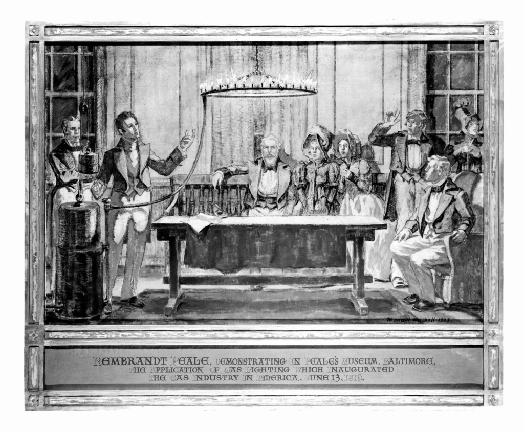 In 1816, Rembrandt Peale began illuminating his Baltimore museum’s galleries with gaslight chandeliers. Up to 100 “gems of light” burned in a metal circle suspended overhead and fueled by gas made from burning pitch. The new technology both enabled Peale to keep his doors open at night, attracting more visitors and revenue after dark, and also served as an attraction itself. People had never seen such bright interior lights before. Those who could not afford the price of admission gathered outside to gawk at the brilliance of the light spilling out of the windows. Excitement about Peale’s “Magic Ring of Fire” led to his founding the Baltimore Gas Company, which by 1817 had begun installing gas street lights throughout the city. Thanks to Peale’s pioneering efforts, Baltimore was the first city in the U.S., and among the first in the world, to be lit by gas, earning it the nickname, “Light City.” The company Peale founded is now known as BGE, one of the oldest continuously-operating companies in the world.